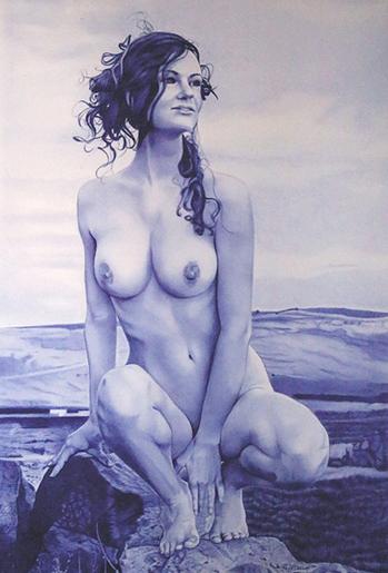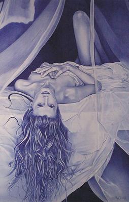 Lozano occasionally checks the goings-on of the ballpoint art world and is familiar with the work of Juan Francisco Casas, another Spaniard known for photorealist artwork of nude women drawn in blue ballpoint pen, with which Lozano's ballpoint work has been compared. When asked his thoughts about Casas' drawings, Lozano replies, simply, ''magnifico'', but he is quick to point out that he had been working in ballpoint long before Casas, and the two have never met. Unlike his compatriot, however, Lozano has yet to come up against negative reaction to the nudity in his artwork. Nor should he expect to; while Casas' drawings are locked into one-track-mind titillation and shock value, Lozano's are more thoughtful works for mature, refined tastes. ''I don't paint grotesque women or overly provocative views,'' Lozano rationalizes. Their techniques also produce dissimilar results; while Casas' use of crosshatching to convey volume remains evident to the viewer, Lozano's linework is much less discernible. And while Casas has recently started adding color, Lozano is fine with blue. ''I tried in every color but blue vision color attracts me especially.''