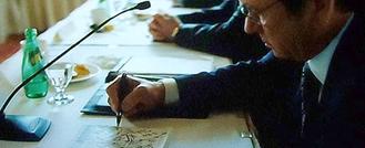 Tommy Lee Jones' senior executive character Gene McClary doodles during a boring meeting (pictured ).