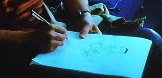 Crude doodles interspersed throughout the closing credits appear to be ballpoint pen, reversed to become white on black. Art credited to the film's director, Spencer Susser.