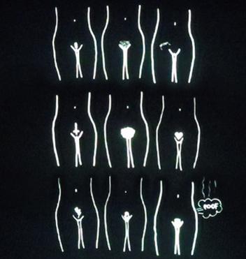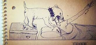 The doodles could've been produced by the film's slacker antihero Hesher (Joseph Gordon-Levitt), but they are, in fact, the work of Susser, himself. As "art", these doodles are as grade school as they come. Body parts, ejaculation, scatology, gastronomy, bongs; everything you'd expect to see on a stoner classmate's folders, flipped from black-on-white to white-on-black. In service of this film, therefore, perfect. In-your-face parting shots to an in-your-face film. Requests for confirmation from Susser as to whether these are actually drawn in ballpoint are as yet unanswered. Regardless, were you to find doodles like this in your own child's notebooks, we recommend: seek help immediately, call the authorities, or run・
