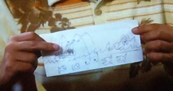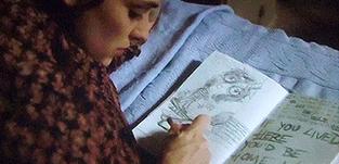 Dustin Hoffman's Raymond Babbet shown doodling in ballpoint in his notebook in a motel room as they wait for a rainstorm to pass.