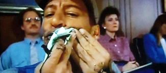 Character actor Jim Varney as trouble-prone Ernest, much-mimicked TV commercial star who also made it to the big screen. In this 1990 film, Ernest does jury duty. In the Jurors' box Ernest realizes the gravity of the proceedings, composes himself and jumps into character as a responsible juror...